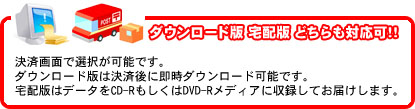 宅配版はデータをCD-RもしくはDVD-Rメディアに収録して決済確認後に発送手続きをいたします。